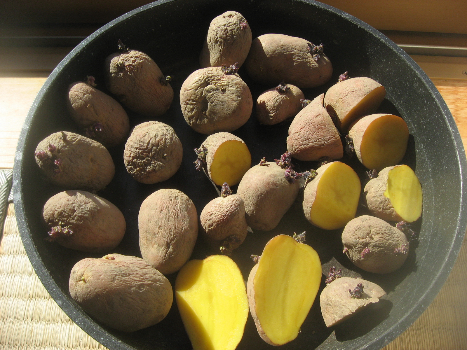 まったく芽が出てないジャガイモもあるんだけど、これは切らずにもう少し日光浴を~
