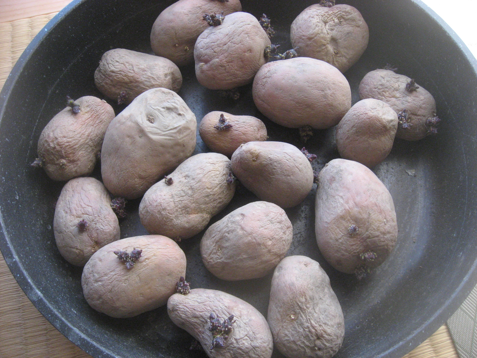 まったく芽が出てないジャガイモもあるんだけど、これは切らずにもう少し日光浴を~